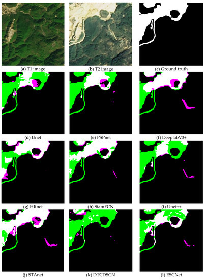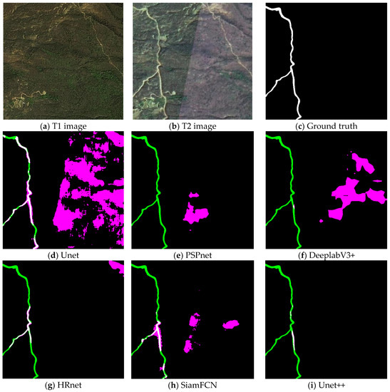 In essence, our deforestation detection method still belongs to the subfield of land cover change detection, and thus it is necessary to compare it with other deep learning change detection models. We choose some other excellent change detection models that have been published in recent years for comparison. Considering that most of the existing change detection methods use an encode–decoder semantic segmentation architecture, we also select several classical semantic segmentation models for comparison. (The detailed information of compared models can be seen in Table 6).