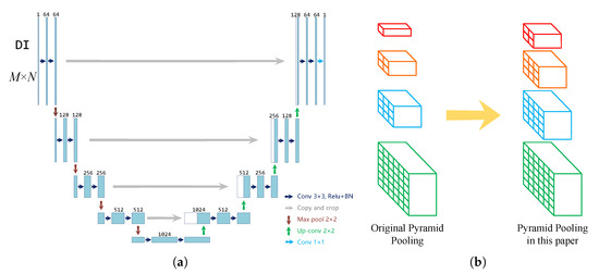 The structure of Unet is shown in Figure 6a. Slightly different from the original Unet network, the parameter in order to maintain the image size before and after the convolution layer. The batchnorm (BN) layer [42] is used after the ReLU layer to accelerate the convergence.