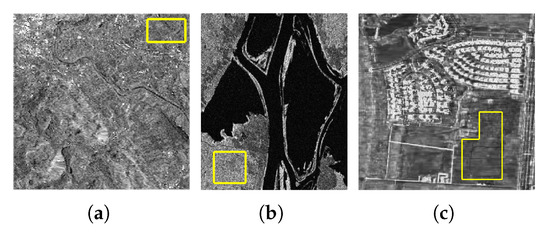 We did not perform despeckling on the Bern dataset and the Ottawa dataset because these two datasets are relatively less noisy. To illustrate this and also to evaluate the effect of despeckling, we select the homogeneous areas and calculate the equivalent number of looks (ENL) of each dataset. The image of each dataset is selected to calculate the ENL. The selected patches of each image are shown in Figure 11a–c. The selected patch of the original Tongzhou image is the same as that of the despeckled image. It can be seen from Table 1 that the Bern dataset and the Ottawa dataset have relatively high ENL and do not require additional despeckling. However, two images of Tongzhou data are single-look images with greater speckle noise. Therefore, the multi-temporal SAR block-matching 3D (MSAR-BM3D) method [47] is used to remove the speckle noise for Tongzhou dataset. The original and despeckled images of Tongzhou dataset are depicted in Figure 10, respectively. The ENL of the despeckled image increased a lot, as shown in Table 1.
