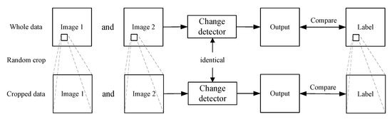 Equation (1) represents the mathematical model of local change detection. Local change detection describes whether a pixel change depends only on its adjacent area and the other pixels are irrelevant. Based on the locality assumption, we design experiments with cropped regions. The original image is randomly cropped and then the cropped patches are used for change detection. We hope to design an unsupervised change detection algorithm that achieves good accuracy on both whole and cropped images.