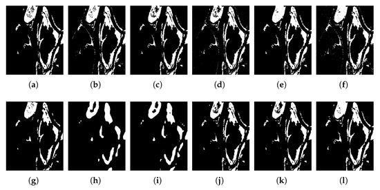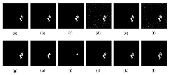 This paper studies local change detection. We break up the image into small patches to test the performance of the method using only local information processing. Traditional segmentation methods may lead to many false alarms if only locally cropped images are processed. If the original images are cropped into small patches, the final change detection results will be very different from the results using full images. In order to solve this problem, in our previous work [34], we proposed a novel thresholding method called histogram fitting error minimization (HFEM) for a little-changed area. After the thresholding using HFEM, conditional random fields (CRFs) are used to model the relationships between the neighborhood pixels. Finally, the small fragments are removed. The fragment removal procedure was called post-processing in our previous work [34]. If the area of the fragment is less than a given value , it will be removed; otherwise, it will be retained. This procedure has been proven to be a very effective way to improve accuracy [31,34,35]. However, needs to be set manually. If is set too large, some truly changed area will be removed. If it is set too small, some larger false alarms will not be removed. Therefore, the post-processing procedure is essentially a supervised manual trial-and-error procedure (MTEP). As for the subject of image binarization, many excellent adaptive binarization methods have been proposed to replace MTEP [1,36,37]. It is meaningful to find a processing method that is not based on manual settings to replace post-processing.
