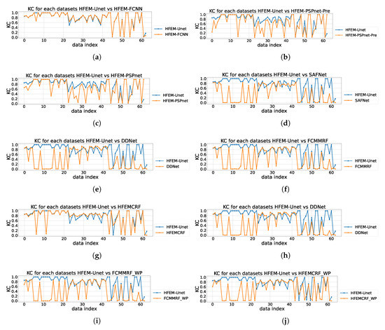 For comparison, we experimented with four contrasting methods, called DDNet [31], SAFNet [25], FCMMRF [44] and HFEMCRF [34]. All four contrasting methods use the fragment removal procedure as postprocessing. Generally speaking, the parameter in the fragment removal procedure is generally set between 20 and 30. is set to 20 in the public code of SAFNet [25,45] and DDNet [31,46]. In our previous work, is set to 25 for HFEMCRF [34]. In order to maintain uniformity, we set to 20 for all four contrasting methods in this experiment. The implementation of the DDNet method is to use the code published by the original authors. The other methods we implemented ourselves according to the original papers. We test four HFENCNNs, including HFEM-Unet, HFEM-FCNN, HFEM-PSPNet and HFEM-PSPNet using pretrained backbone (HFEM-PSPNet-Pre).