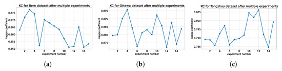 We set the same hyperparameter and repeated experiments 15 times on the three datasets, respectively, to see how much performance is affected by randomness. The purpose of this experiment is to demonstrate that the performance of our method is reproducible and less affected by randomness. Let R represent the difference between the maximum value and the minimum value of the kappa coefficient in multiple experiments. As we can see from Figure 20, for Bern dataset, , for Ottawa dataset, , and for Tongzhou dataset, . The values in Table 2, Table 3 and Table 4 are the results of setting the random seed to 2022 for repeatability. Compared with the results in Table 2, Table 3 and Table 4, the proposed method is relatively stable and less affected by randomness.