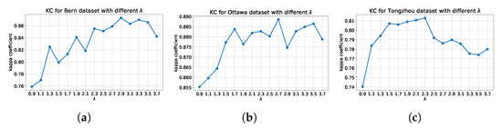 Furthermore, as long as is set to about 2 to 3, the basic performance of the algorithm can still be guaranteed. We calculated the difference between the maximum and minimum kappa coefficients of the detection results when lambda equals . Let R denote the difference between the maximum value and the minimum value of the kappa coefficient using different . For Bern dataset, , for Ottawa dataset, and for Tongzhou dataset, . The difference is , and on Bern, Ottawa and Tongzhou datasets. Considering the impact of random initialization, the impact of changes in is even more negligible. For the Ottawa dataset, the influence of on the kappa coefficient is even lower than the influence of randomness on the kappa coefficient, which shows that the influence of lambda on the result is completely submerged in random noise. This shows that in such an interval, the effect of the method is relatively robust with respect to the selection of parameter .