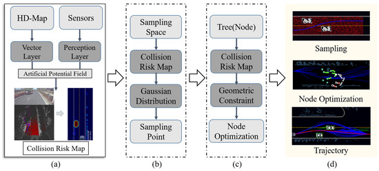 As shown in Figure 2a, we generate the CR-Map through the vector layer of the HD-Map and the perception layer of the sensors, drawing on the idea of the APF method. The CR-Map can describe the risk coefficient of the collision between the autonomous vehicle and other obstacles on the road. The CR-Map is expressed in the form of a grid map, and each grid point has a collision risk coefficient. Regions with high collision risk coefficients are more dangerous than regions with low collision risk coefficients and will be given lower priority in the sampling space. Each node in our algorithm is assigned a collision risk coefficient. In the process of node optimization, the collision risk coefficient of each node is taken into account when calculating the cost function. The CR-Map can provide prior information and heuristic guidance for the sampling and node optimization processes. As shown in Figure 2b, we obtain sampling points in the sampling space through the CR-Map and Gaussian distribution. The CR-Map can provide heuristic guidance for the sampling process and improve the sampling efficiency of the algorithm. The sampling range and density are adjusted using the Gaussian distribution. The node optimization process in Figure 2c focuses on optimizing the parent–child relationship of the nodes in the tree. The cost function for determining the optimal parent node takes into account multiple factors such as the trajectory length, trajectory curvature and collision risk coefficient to improve the convergence rate of the algorithm. Moreover, the lane geometry information and traffic rule information provided by the HD-Map are used to constrain the node optimization process. Figure 2d shows examples of the sampling process, node optimization process and planned trajectory set.