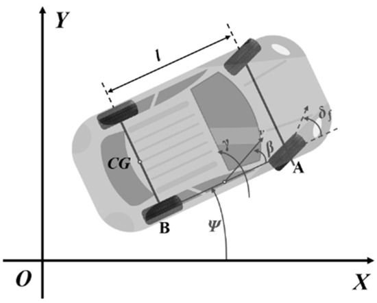 In Figure 4, the vehicle’s state space is , where represents the coordinates of mid-point of rear wheel, as shown by point CG. The represents the intersection angle between the head direction and coordinate axis, represents the wheelbase length. The kinematics of a front-steering vehicle can be expressed using Equation (1):