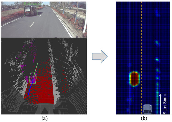 Figure 5a shows the perception layer, and Figure 5b shows the CR-Map. In the CR-Map, the value of the collision risk for each grid point is represented. The collision risk values of different points in the CR-Map vary with the color. The dark-red points have large risk values, and the dark-blue points have small risk values. The collision risk values of the yellow and green points are between the dark-red points and the dark-blue points. The larger the grid point value on the CR-Map, the higher the risk of a vehicle collision. The maximum value is set to ten, and the minimum value is set to zero. When the collision risk of an area is 10, this area is inaccessible to a vehicle, as in the dark-red areas. When the collision risk of an area is zero, this area is feasible for a vehicle, as in the dark-blue areas in the map. The CR-Map construction method is described below.