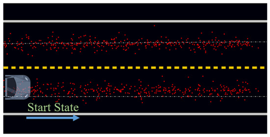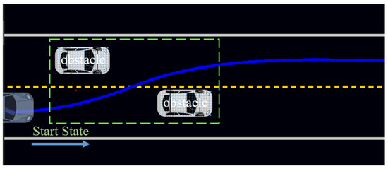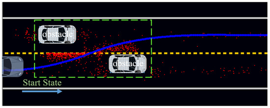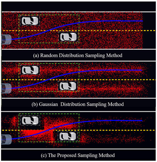 This scenario has two lanes in the same direction, separated by a dashed yellow line. In Figure 15, the blue vehicle represents the starting position of the AV, the white vehicles are stationary obstacles, the red points are the sampling points and the blue curve is the optimal trajectory. The area around the obstacles is our area of interest (AOI), which is the green dotted box area. In sampling-based motion planning algorithms, avoiding obstacles is the key process. When the sampling points are concentrated around the obstacles, the feasible trajectory can be obtained faster, and the iteration times of the algorithm can be reduced. Figure 15a shows that the sampling points obtained by the random distribution sampling method are uniformly distributed in the configuration space. This random approach is very inefficient. The points sampled using the Gaussian method in Figure 15b are distributed near the center line of the two lanes, but there are few points in the obstacle area. Different from the two methods, the proposed sampling method in Figure 15c significantly increases the number of samples in the key area near the obstacles. This is achieved by increasing the probability of sampling in the gradient descent regions on the CR-Map. The CR-Map is a grid map reflecting the collision risk coefficient on the road, and the gradient descent regions cover the surrounding areas of the obstacles.