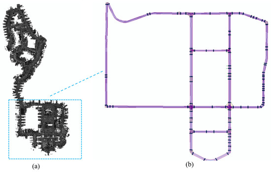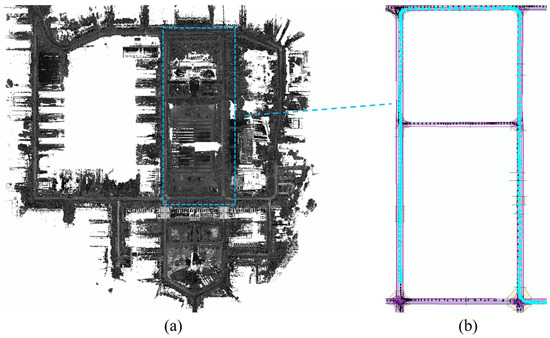 Figure 18a shows the experimental environment of the algorithm efficiency experiment, the purple part of Figure 18b is the vector layer of the map and the blue points are the trajectory of this experiment. The trajectory is about one kilometer long, with one intersection and three T-junctions. Several sensors were used including a map module, integrated navigation system, LIDAR module, vision module and the AV’s control system. In the motion planning system, the re-planning command would be triggered when the planned trajectory encounters obstacles, drives to the re-planning point or decides to change the trajectory. We set a motion planning process from the beginning to obtain the first feasible trajectory as one full-cycle re-planning process. Table 9 shows the statistical data of each planning after each algorithm completed the experiment.