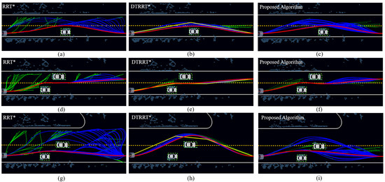 In each result of Figure 17, the light-blue car on the left represents the starting position of the vehicle, the white vehicles represent the obstacles and the direction is from left to right. The green curves are the tree, the blue curves are the trajectories and the red curves are the optimal trajectories. In Figure 17b,e,h, the yellow polylines are the reference trajectories generated using the DT-RRT algorithm. The light-blue points outside the road boundary are the projection points of the LIDAR point cloud.
