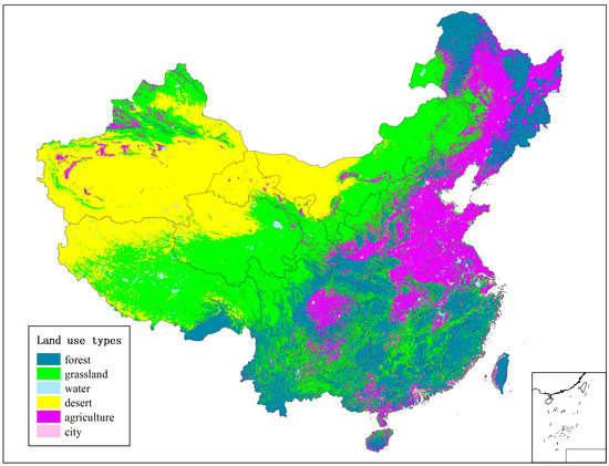 China is located in the east of Eurasia, along the west coast of the Pacific Ocean, and it is the world’s third largest country, with a territory area of 9.6 million km2 lying between latitudes 18° and 54°N and between longitudes 73° and 135°E. The landscape is generally characterized by major mountain ranges on the western side, high plateaus in the north, and low-relief regions in the east. Most of its rivers generally flow to the east. Broad grasslands predominate on the edges of the Inner Mongolian Plateau in the north, while Southern China is dominated by hills and low mountain ranges. To the east, extensive alluvial plains along the shores of the Yellow and East China Seas are dedicated to intensive farming activities. Across China, the terrain gradually descends from east to west. The Qinghai Tibet Plateau, known as “the roof of the world,” is the largest and highest plateau, with an average elevation of more than 4000 m. Mount Qomolangma, the highest peak in the world, is located on the plateau and is the main Himalayan peak. The climate is regionally variable, reflecting the country’s complex topography, and is primarily characterized by dry seasons and wet monsoons. The rainfall generally decreases from the southeast to the northwest. China’s land-use classes mainly include six categories of forest, farmland, grassland, city and town, bare land and desert, and water body (Figure 1). The vegetation regions mainly include forest, farmland, grassland, and desert.