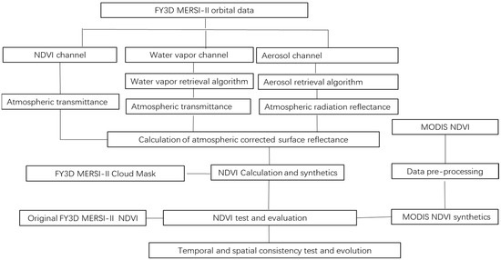 The technical framework for bias correction based on the NDVI with the L1 original radiation data was developed, and the technical route is illustrated as follows: (1) the Fy-3D/MERSI-II orbital data preprocessing steps included HDF data analysis, radiation calculation, band data extraction, angle data extraction, etc.; (2) atmospheric aerosol retrieval from the MERSI data was performed based on the black target algorithm; (3) the atmospheric transmittance, atmospheric scattering reflectance, and atmospheric spherical albedo were calculated; (4) the surface reflectance was obtained using an atmospheric correction of the orbital data; (5) The calculation of the NDVI with surface reflectance was tracked; (6) the 16-day and monthly NDVI products were synthesized; and (7) the FY3D-NDVI was validated. A flow chart is shown in Figure 2.