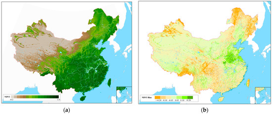 The spatial distribution of annual FY3D MERSI-II NDVI bias (a) and annual FY3D NDVI bias based on MODIS NDVI (b) during 2020 and 2021.