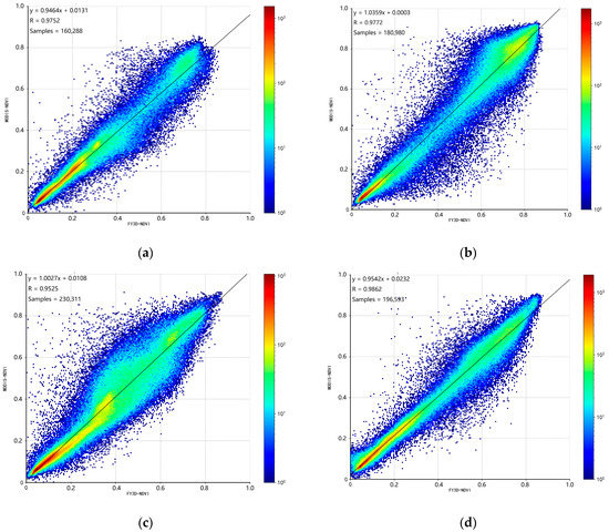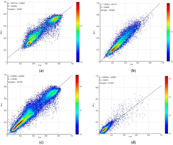 Density scatter plots of FNDVI versus MNDVI for different vegetation types: (a) forest NDVI, (b) agriculture NDVI, (c) grassland NDVI, (d) desert NDVI.