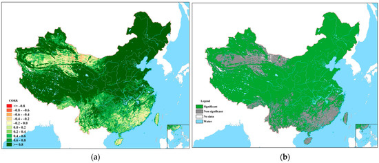 As observed in Figure 7b, in the desert areas of some provinces in Xinjiang, Inner Mongolia, and Gansu, the results of the significance test revealed that the correlation was not significant. The significance test for mountainous areas of Yunnan, Tibet, Fujian, Guangdong, and other provinces showed a non-significant correlation, while other regions were significantly correlated.