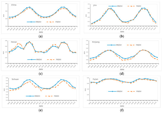 Figure 8 shows that both the time-series FNDVI curve and MNDVI curve in the whole country were close to the FONDVI sequence. The FNDVI in Xinjiang was significantly improved compared with the FONDVI, which is consistent with MODIS. For Fujian Province, the FNDVI was quite different from the MNDVI, while for other provinces they were close to the MODIS curve. The main reason is that Xinjiang has limited vegetation and a low value of NDVI, while Fujian has good vegetation coverage and a high value of NDVI in a complex terrain.