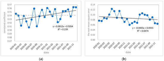 Comparison of the (a) coefficient of variation and (b) root-mean-square error between FNDVI and MNDVI from January 2020 to December 2021.