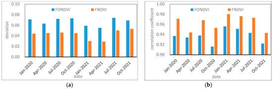 Comparison of the average absolute deviation (a) and correlation coefficient (b) between FONDVI and FNDVI products relative to MNDVI.
