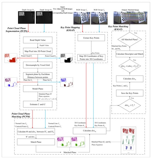 Figure 1 shows the flowchart of the proposed IM_CPE. Given two adjacent RGB images and , with their corresponding depth images and , firstly the KMAP algorithm is applied to and , to extract the 3-D coordinate key points and . Simultaneously, the proposed PCPS algorithm is applied to and to segment the point cloud planes by Euclidean clustering. Then, the PCPS algorithm models the segmented point cloud planes and to gain the plane equations and further estimate the normal vector L and centroid G of the planes. After L and G are calculated, the proposed PCPM algorithm matches two point cloud planes if the centroid of a plane from is the closet to another centroid from and the angle of the normal vector of the planes is the smallest. With the point cloud planes matched, the KMAT algorithm is proposed to determine which planes the key points from and belong to. Next, the Euclidean distance of two 3-D key points on a pair of matched planes is calculated for coarse matching. If is below the distance between the centroid of the matched planes, the two key points can be regarded as a potential match and the descriptors of the two key points are calculated for fine matching.