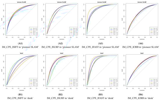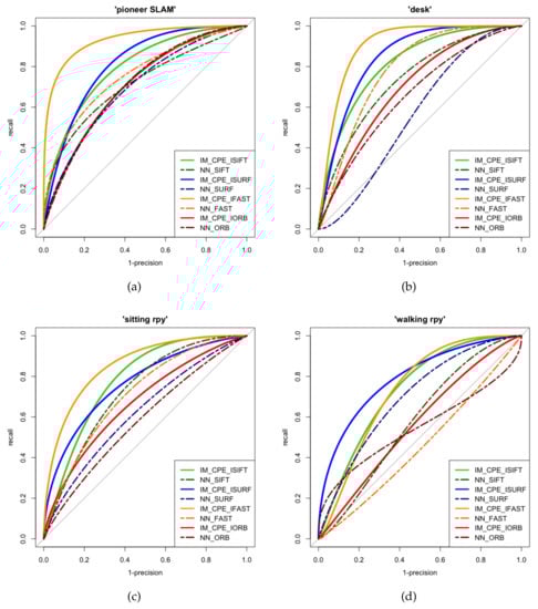 As we mentioned in Section 4.1, the performance of IM_CPE is better when . Thus, we chose for comparison. Figure 6 demonstrates the comparison of IM_CPE and the existing NN method using different key point methods in the four sequences in terms of recall v.s. 1-precision curve. It can be seen from Figure 6 that all the recalls of four key points extraction algorithms using IM_CPE were able to approach 1 faster than the NN method, especially SIFT [], FAST [], and SURF []. Although the result of IM_CPE using improved ORB is not obviously improved compared to other key points algorithms, it still performs better than using NN for matching even in the worst case.