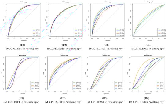 Comparison of proposed IM_CPE in terms of various s: 1st row, ‘pioneer SLAM’ sequence; 2nd row, ‘desk’ sequence; 3rd row, ‘sitting rpy’ sequence; 4th row, ‘walking rpy’ sequence; (A1–D1) the result of IM_CPE using improved SIFT [] (IM_CPE_ISIFT) under different s; (A2–D2) the result of IM_CPE using improved SURF [] (IM_CPE_ISURF) under different s; (A3–D3) the result of IM_CPE using improved FAST [] (IM_CPE_IFAST) under different s; (A4–D4) the result of IM_CPE using improved ORB [] (IM_CPE_IORB) under different s.