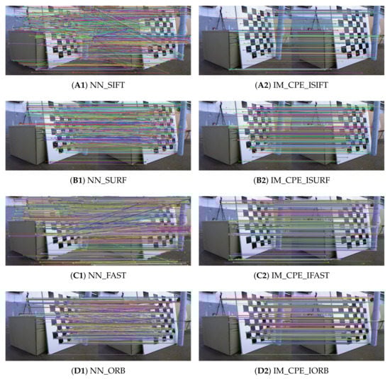 Comparison of matching result of ‘pioneer SLAM’ with the proposed IM_CPE and the existing NN method using different key points extraction methods: (A1) NN Using SIFT (NN_SIFT) []; (A2) proposed IM_CPE using improved SIFT (IM_CPE_ISIFT); (B1) NN Using SURF (NN_SURF) []; (B2) proposed IM_CPE using improved SURF (IM_CPE_ISURF); (C1) NN Using FAST (NN_FAST) []; (C2) proposed IM_CPE using improved FAST (IM_CPE_IFAST); (D1) NN Using ORB (NN_ORB) []; (D2) proposed IM_CPE using improved ORB (IM_CPE_IORB).