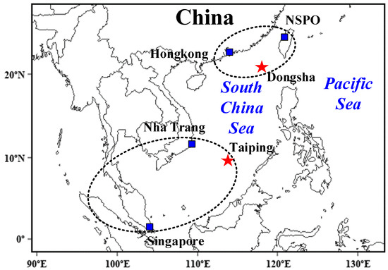 Locations of the observation sites in this study. Dongsha Island and Taiping Island sites are shown as red stars, and other sites are shown as blue squares. All stations are affiliated with AERONET.
