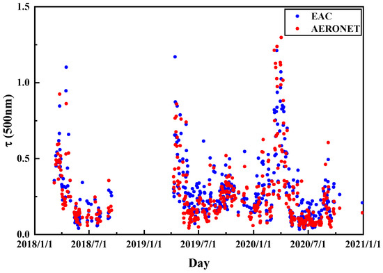 Comparison of τ (500 nm) obtained by AERONET and EAC4 at Dongsha Island.
