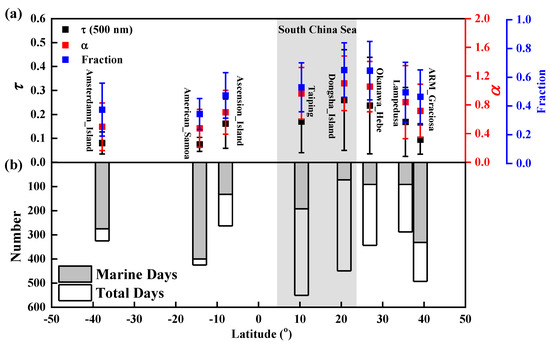 Global annual average, meridional distributions of (a) τ at 500 nm, α (440–870 nm), FMF; (b) the total number of samples and pure maritime days.