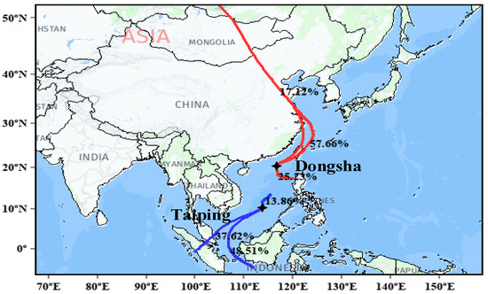 The Hysplit Dispersion Model was used to calculate the 120-h backward trajectory ending at Dongsha and Taiping to determine the source of the air mass (Figure 8). Each trajectory was linked to the corresponding aerosol optical depths. Previously, this method has been widely used to evaluate the distribution characteristics of aerosol optical depths of different air masses [30,31].