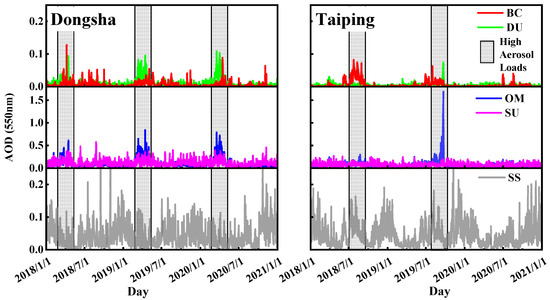The values of τF (500 nm) were also high (>0.19), and the highest value was 1.8. Since there is no significant anthropogenic activity in Taiping, it is likely that the fine particulate matter in these cases originated mainly from mainland industrial/urban areas. Similarly, the α (440–870 nm) value of Taiping Island was less than 0.9 on two days of high aerosol loading days. However, α (440–870 nm) values were relatively low (<0.88) with high τF (500 nm) values (approximately 0.22). These behaviors suggest that coarse particles were transported from other locations, as there was no local coarse particle activity in Taiping in addition to sea salt aerosols. In this event, the high τ values observed were associated with a sustained monsoon climate centered in the SCS, which favours the transport of anthropogenic particles emitted from Southeast Asia to the SCS. According to the EAC, the aerosol optical depths of black carbon aerosol (BC), dust aerosol (DU), organic matter aerosol (OM), sulfate aerosol (SU) and sea salt aerosol (SS) in Dongsha and Taiping are shown in Figure 6. It reveals that high aerosol loading in Dongsha and Taiping Island was caused by the sharp increase in black carbon aerosols, dust aerosols and organic aerosols in addition to sea salt aerosols. Figure 7 shows the distribution of BC in Dongsha and OM in Taiping and its surrounding areas before and after the high aerosol loading in 2019. BC and OM are typical urban aerosols. The appearance of these two aerosols confirms the intrusion from foreign air masses in the process of high aerosol loading. Therefore, the high loading of fine particles in Dongsha mainly originated from BC and OM brought from the southeastern coast of China. A small amount of coarse DU particles were loaded from Mongolia. In addition, the high fine particle loading in Taiping was mainly produced by OM and BC, which came from Southeast Asia, including Singapore and the region between Singapore and Indonesia.