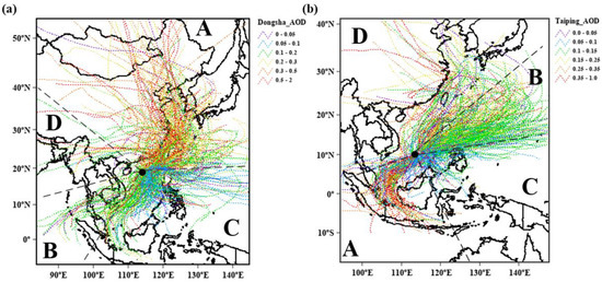 Five-day trajectories ending at 500 m from January 2018 to January 2021 at (a) Dongsha and (b) Taiping; The color of the trajectory represents the value of aerosol optical depth. One trajectory per day was displayed; The different source areas are separated into four sections (A, B, C and D), as shown in the panel.
