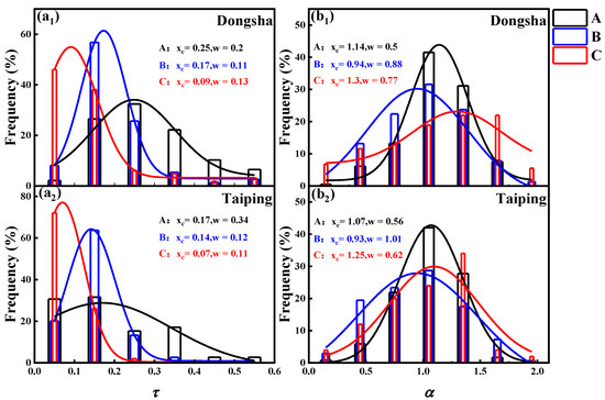 Distribution of the frequency of occurrences of (a1,a2) τ, and (b1,b2) α in three sectors: A, B, C. These data are shown in black (sector A), blue (sector B) and red (sector C). The distribution of different sectors (colored lines) was identified by Gaussian fitting (fitted line, y = y0 + (A/(w*sqrt(pi/2)))*exp(−2*((x − xc)/w)^2)). The center value (xc) and waist width (w) of each part of the Gaussian function are shown.