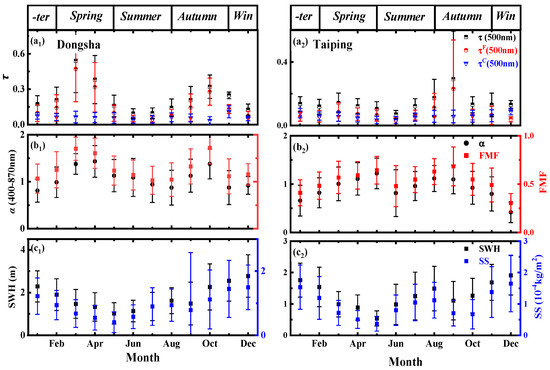 Monthly mean values of (a1,a2) τ (500 nm), τF (500 nm), τC (500 nm), (b1,b2) α (440–870 nm), (c1,c2) the significant height of combined wind waves and swell (SWH) and sea salt aerosol mass concentration FMF in Dongsha and Taiping from January 2018 to December 2020. The error bars are standard deviations.