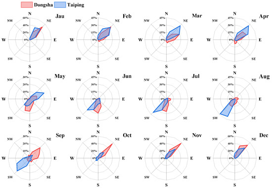 Monthly wind rose graphics obtained at Dongsha and Taiping island for three years.