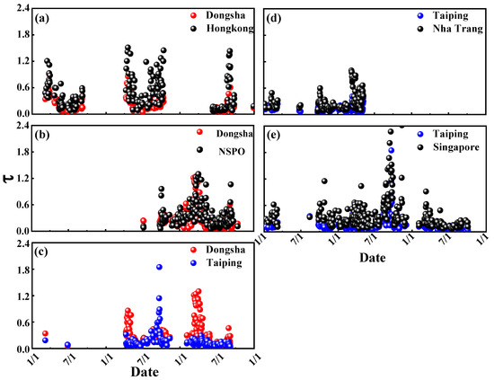 Comparisons of τ (500 nm): (a) Dongsha Island and NSPO, (b) Dongsha Island and Hong Kong, (c) Dongsha Island and Taiping Island, (d) Taiping Island and Nha Trang, and (e) Taiping Island and Singapore.