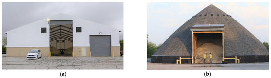 Samples of salt storage facilities: (a) rectangular barn and (b) dome.