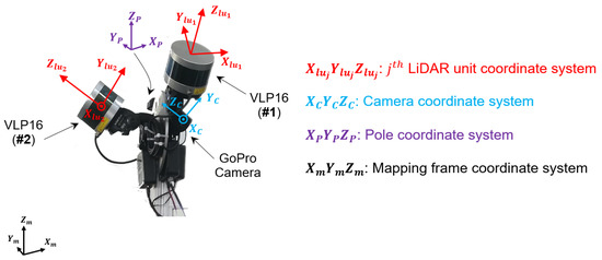 - , are the mounting parameters (lever arm and boresight rotation matrix) for the LiDAR unit relative to the pole coordinate system;