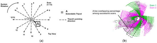Data collection procedure for the SMART system and acquired LiDAR scans: (a) seven to thirteen scans are acquired at a given station and (b) limited overlap area between two successive scans.