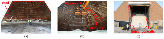 Demonstration of physical features constituting the dome storage facilities: (a) roof, (b) roof stringers, and (c) entrance walls (the SMART system is tripod-mounted at the center, roof-mounted at the center, and tripod-mounted at the entrance in these three examples, respectively).