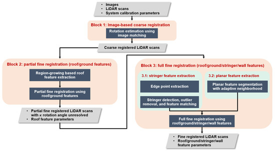 An important data processing step when dealing with static LiDAR data is aligning (registering) different point clouds to a common reference frame. The registration process aims at estimating the 3D similarity transformation parameters—i.e., three rotation angles, three translations, and a scale factor—between two datasets, denoted as reference and source point clouds. For a well-calibrated LiDAR sensor, the laser range provides the true scale; thus, the registration parameters reduce to six (scale factor is unity). Registration can be conducted using either point- or feature-based strategies. Point-based approaches assume that the datasets are roughly aligned. The Iterative Closest Point (ICP) is a common approach that uses spatial proximity to establish point pairs between the reference and source point clouds for the derivation of registration parameters through a Least Squares Adjustment (LSA) procedure [13,14]. Establishing point pairs and estimating the registration transformation parameters are conducted iteratively until the root mean square of distances between conjugate points is smaller than a pre-defined threshold. ICP and its variants have been used in several other studies [15,16,17]. For example, instead of identifying direct point-to-point correspondences, Al-Durgham et al. [17] assigned each point in the source point cloud to a triangular patch (i.e., closest three points) in the reference one. Then, the source points are projected onto the respective reference patches to derive point-to-point correspondences, which are then used for the estimation of registration parameters. ICP and its variants are widely used in several fields dealing with point cloud registration. Cardani et al. [18] utilized ICP to fine-tune the alignment of LiDAR scans collected inside historical masonry vaults for survey and shape computation. Glira et al. [19] performed strip adjustment of Airborne Laser Scanning (ALS) data while using several variants of the ICP algorithm. Although point-based techniques can efficiently conduct the registration process, they will fail whenever the initial transformation parameters are not of good quality and/or there is only a small percentage of overlap between the reference and source point clouds. Moreover, such methods are sensitive to variations in the point density. For the SMART system, acquired data from different scans have minimal overlap and exhibit significant variation in point density (the nature of acquired point clouds will be shown later in the next section).
