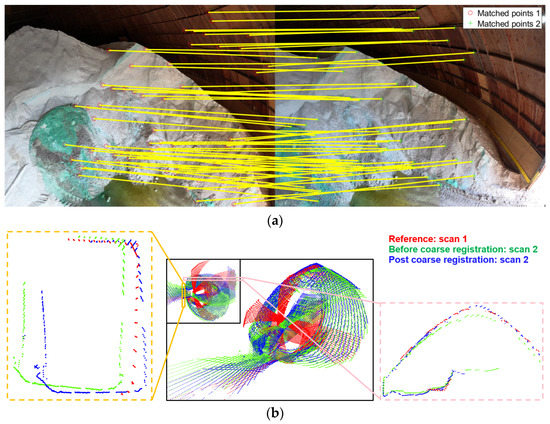 Image-aided coarse registration results for two successive scans in the West Lafayette dataset: (a) identified conjugate points between captured images in these two scans and (b) comparison of the before/post coarse registration results through a perspective view (middle) and two vertical profiles of the facility entrance (orange dotted box on the left) and the facility roof (pink dotted box on the right).