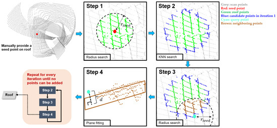 Figure 11 shows the proposed steps for the roof segmentation strategy. In the first step, given an interactively selected seed point on the roof, a seed region is derived through a user-defined search radius, , which is set in a way where the defined seed-region can be assumed to be planar, e.g., . In Figure 11, the seed region is defined by the green points. Then, a region growing is conducted through a two-stage procedure. First, for each point in the seed region, we identify the nearest neighbors, while excluding points that belong to the seed region. The accumulated neighbors are considered as potential candidates for the augmentation (blue points in step 2 of Figure 11). Then, for each point in the potential candidate list, we derive neighboring points, which belong to the seed/previously segmented region within a search radius . If the normal distance between the potential candidate point in question and the local plane defined by neighboring points is less than a predefined threshold, the potential candidate point is augmented to the roof surface (steps 3 and 4 in Figure 11). The region growing process (steps 2, 3, and 4) is repeated until no more points can be added to the roof segment. A sample of segmented roof points for a LiDAR scan is shown in Figure 12. Since there is a single roof, we do not need to conduct a matching process for extracted roof surfaces in the different scans.