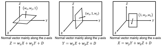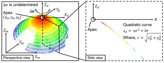 where () represent the transformed scan coordinates of the points along the roof surface after being shifted to the dome coordinate system (i.e., , with () defined by Equation (1)).