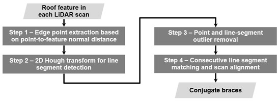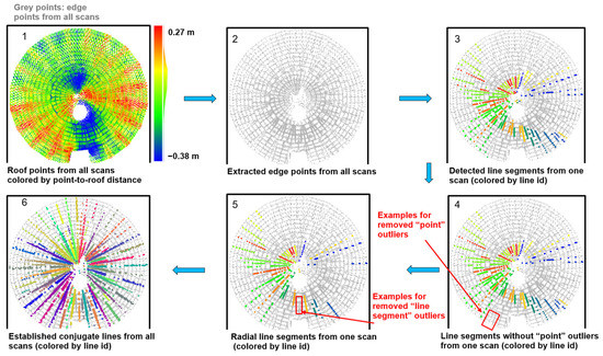 The stringers will be extracted from the previously segmented roof features from the scans when the SMART system is located close to the center of the facility, e.g., tripod-mounted in Figure 7a or ceiling-mounted in Figure 7b. The stringers follow the shape of the dome surface. Therefore, they can be modeled as quadratic curves. However, their projection onto a horizontal plane defined by the levelled scans, following the partial fine registration, would define straight lines that converge towards the apex. These characteristics of the stringers are used for their extraction and matching. Specifically, a four-step data processing workflow is implemented to derive conjugate stringers among acquired scans, as depicted in Figure 14.