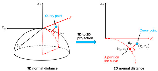 Schematic diagram of point-to-quadratic surface distance (left) and its 2D projection (right).