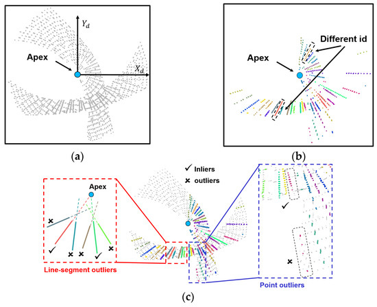 An example of 2D line segment detection results: (a) projected edge points, (b) detected 2D line segments (colored by id), and (c) point and line-segment outliers.