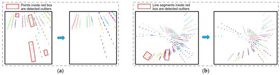 Examples of removed outliers: (a) point outliers (left: before, right: after) and (b) line-segment outliers. Line segments are colored by id (left: before, right: after).