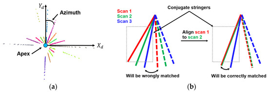 Illustration for the stringer matching: (a) definition of the stringer azimuth and (b) the successive matching procedure for mitigating the error propagation.