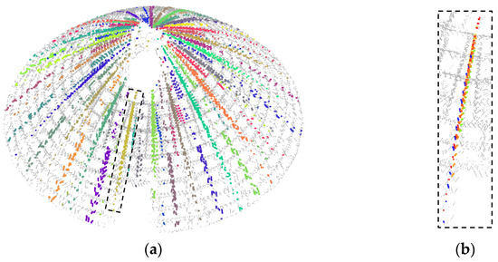 Established conjugate stringers for the West Lafayette dataset: (a) conjugate stringers from 13 scans (colored by stringer ID) and (b) a zoomed-in region for one stringer (colored by scan ID) (edge points are colored with grey).